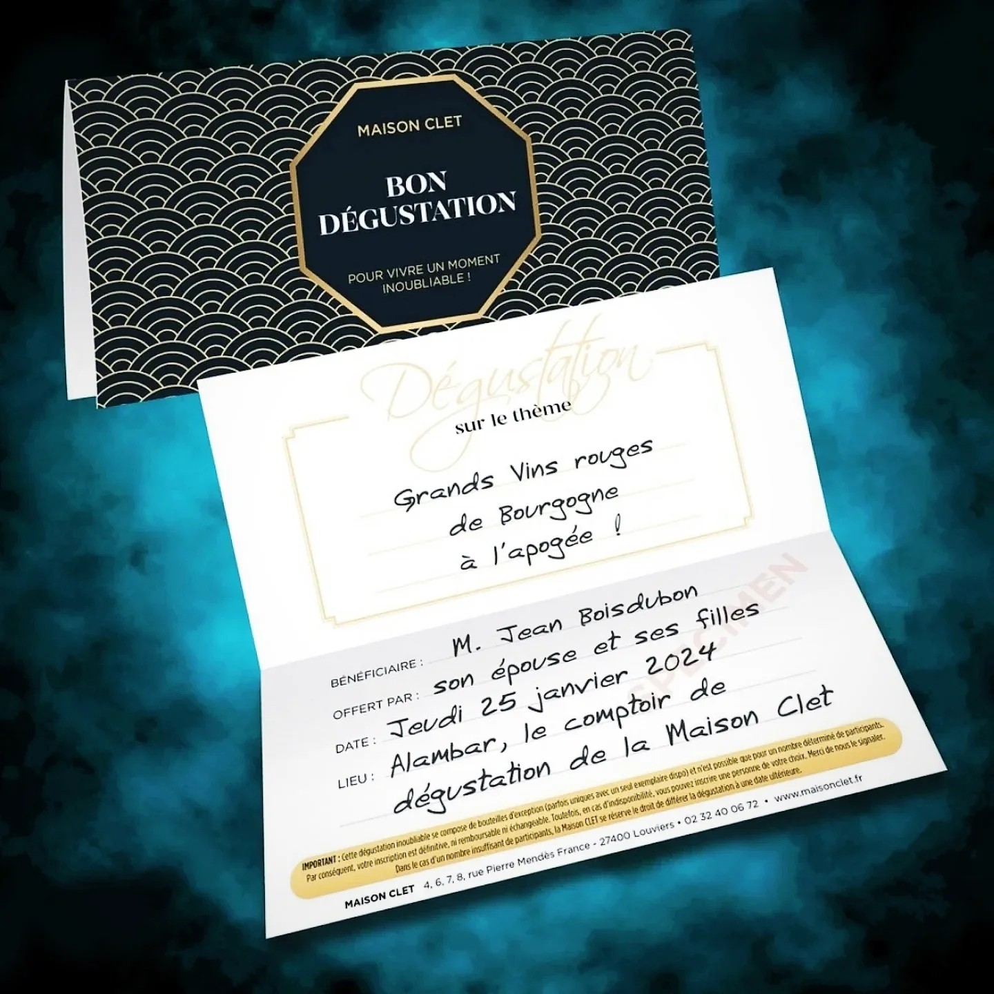 Un BON DEGUSTATION est proposé pour offrir ces dégustations avec un élégant support.